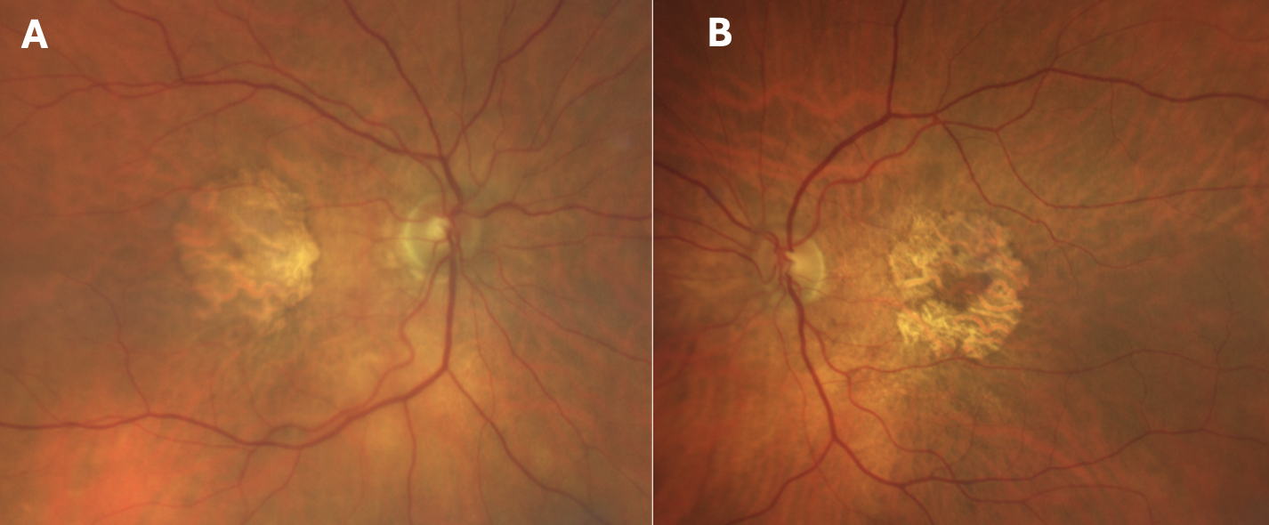 A 90-year-old White man presented for a comprehensive eye examination. The patient had a history of hypercholesterolemia. At the time of the examination, the patient reported taking AREDS supplementation. His BCVA was 20/25 OD and 20/40 OS. Based on the physical examination and CFP imaging, the patient was diagnosed with dry AMD with drusen, pigment mottling, and GA in both eyes (Figure 2). The patient was referred to a retina specialist for evaluation and possible participation in a complement inhibitor clinical trial. To our knowledge, he has not started to receive intravitreal injections as treatment for his GA.