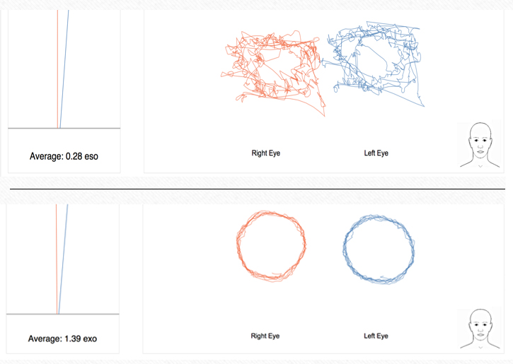 Figure. A readout from the RightEye tracking system shows the patient’s baseline fixation after brain injury (top) and after several weeks of therapy (bottom).