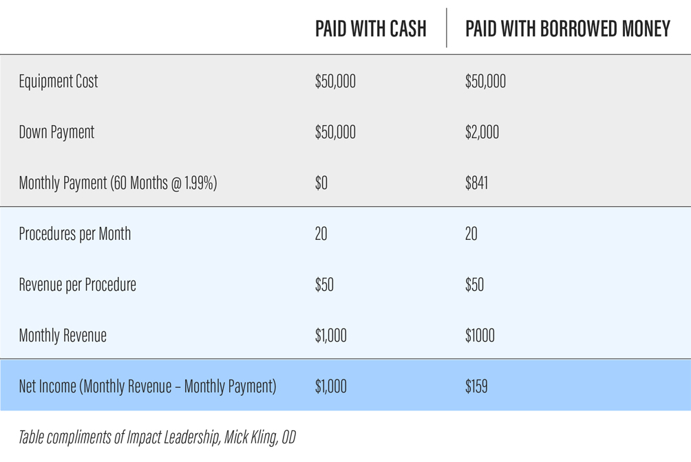 When making equipment purchases, it is easy to fall into the trap of only considering the monthly payment of low-interest loans and leases when estimating affordability. What often gets lost is that we are adding crushing debt to our balance sheet, which can add enormous strain on the cash flow of the practice. Paying cash for equipment will always be healthier for your practice (Table).