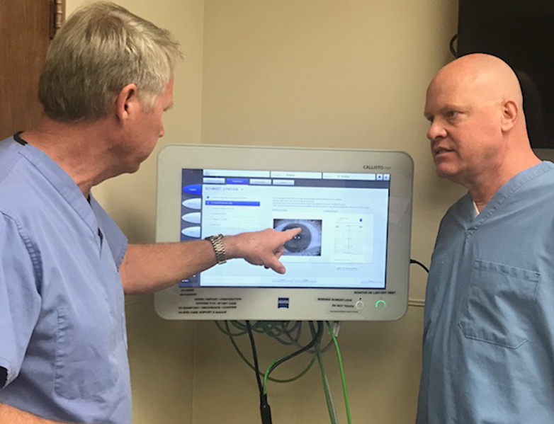 Figure 1. Mark Kontos, MD (left), and referring optometrist Rob Sorrenson, OD, review a patient’s surgical plan.