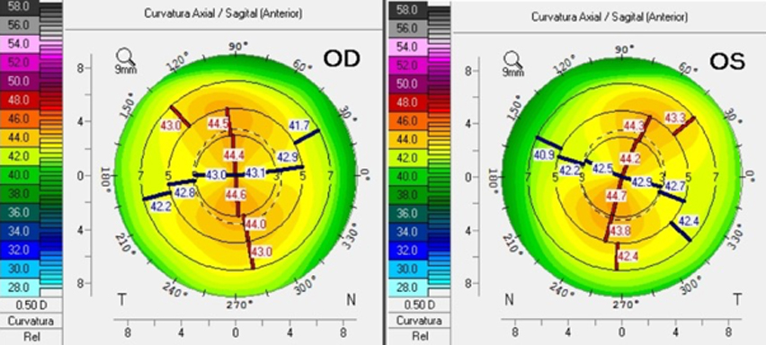 Figure. Corneal tomography of a 25-year-old patient who is a candidate for laser vision correction. The patient has a refraction of -3.75 -0.75 @ 5o OD and -4.00 -1.00 @ 165o OS. Topography shows regular symmetric with the rule astigmatism of 1.4 OD and 1.6 OS.