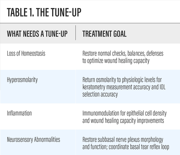 Healthy vision is like a high-performance sports car that is expected to perform well under a wide variety of conditions. However, with DED, performance is limited, and an eye with an unhealthy LFU is one that needs a tune-up. Consider the four items listed in Table 1—a preoperative, four-point tune-up checklist for enhancing the patient’s postoperative high-performance vision machine. The potential for decreasing postoperative complaints, postsurgical refractive surprises, repeat refractions, final glasses optical lens revisions, touchups or enhancements—as well as the potential of decreasing additional chair time—are added benefits for your proactive approach.
