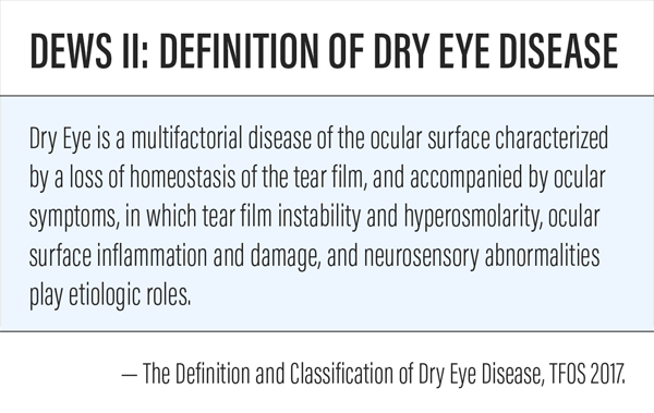 DED is accompanied by tear film instability—a feature so significant that it is part of the definition of DED in the Tear Film and Ocular Surface Society Dry Eye WorkShop II (TFOS DEWS II) report (Figure 1). In other words, DED is a vision-impacting disease. Stabilizing the tear film is no easy task, however, and it is easier with a collaborative, integrated, proactive approach.