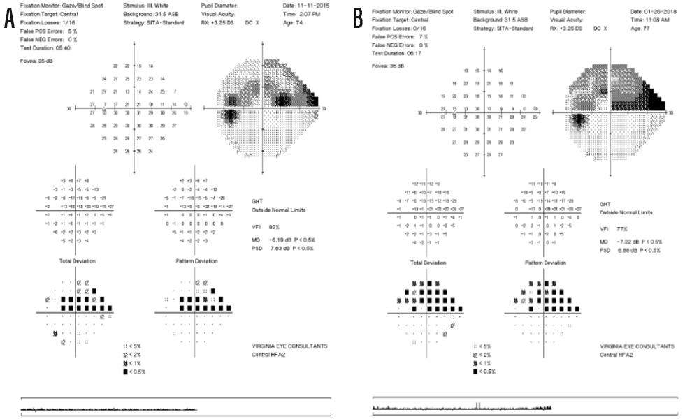 Figure 1. Standard printouts of 24-2 visual field tests in 2015 (A) and 2018 (B). Note the increased defect density on the deviation and grayscale plots. The indices on the right hand side in each printout also indicate progression (VFI, VF index; MD, mean deviation; PSD, pattern standard deviation).