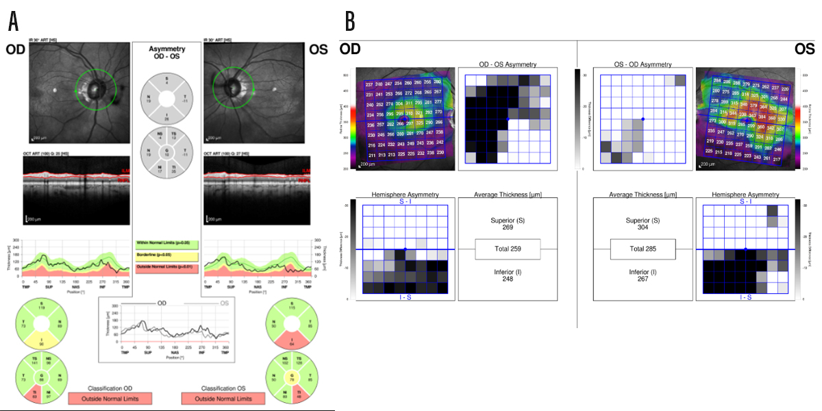 Figure 2. Spectralis OCT (Heidelberg Engineering) scans of the patient in Figure 1. Note the dense defects in the inferotemporal area of the retinal nerve fiber layer scans in both eyes (A) and the corresponding loss inferiorly on the ganglion cell–inner plexiform layer scan (B). These defects directly correspond with the dense visual field defect seen in the left eye in Figure 1.