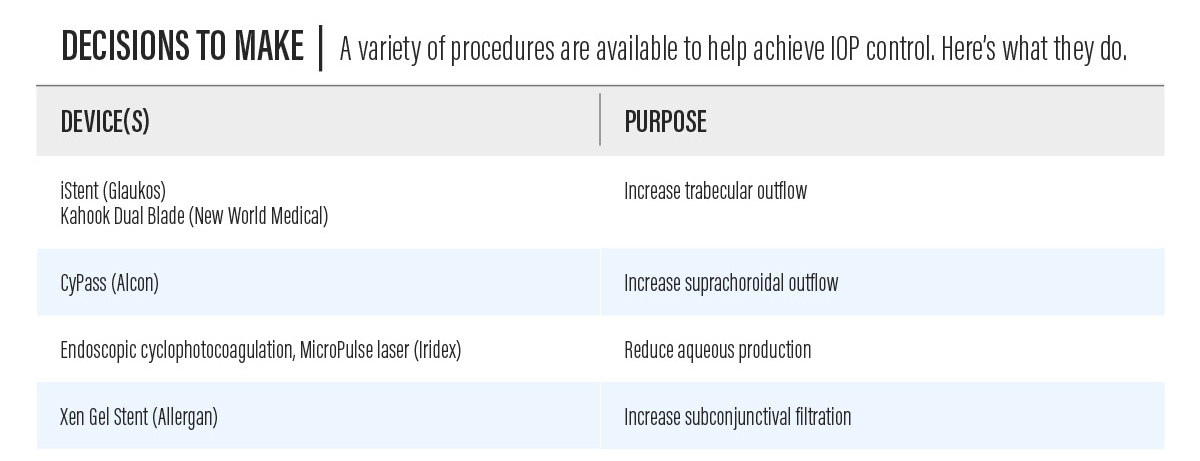 Historically, treating a newly diagnosed patient with open-angle glaucoma (OAG) consisted of setting a target intraocular pressure (IOP) and prescribing an appropriate eye drop to achieve that target. This plan, however, comes with problems: ever-increasing costs of medications, constant counseling on the need for daily compliance, and any number of side effects. Prior to recent innovations, surgical intervention was traditionally regarded as treatment only for advanced or refractory cases that did not respond sufficiently to medical and laser options.