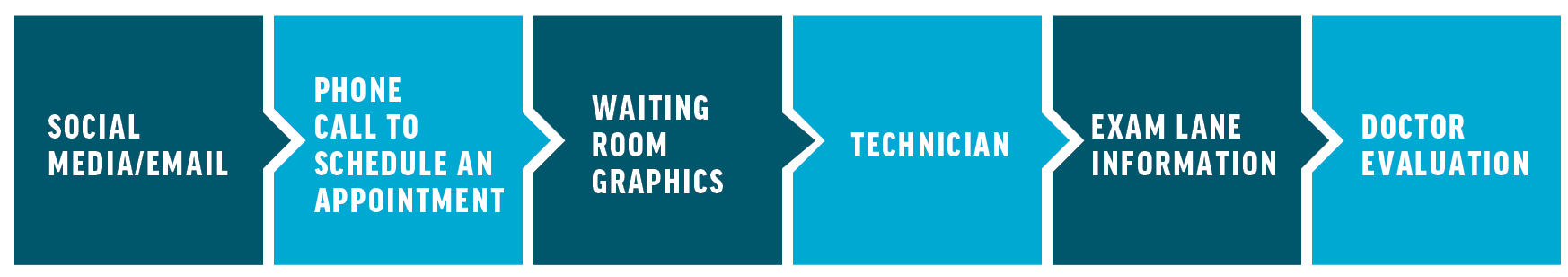 The process continues when patients arrive at your office. In your waiting room, are patients exposed to infographics and videos about DED? Subsequently, the technician should ask questions about symptomatic DED and talk with enthusiasm about the treatments you offer. Finally, in the exam lane, the patient should notice educational material about DED or in-office procedures. This way, by the time you walk into the room, he or she has already thought about DED and is open to discussion and treatment.