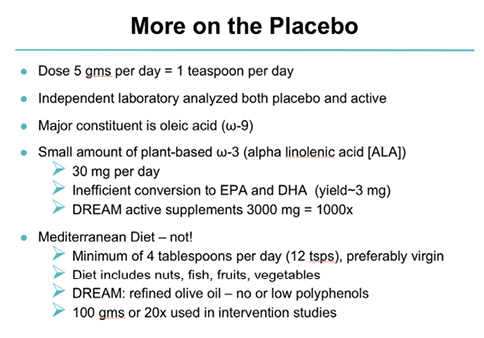 He continued, “The equivalent therapeutic response in both DREAM groups logically arouses suspicions that even low doses of the refined, very low phenolic content olive oil control may have a significant therapeutic effect, particularly in real-life scenarios where overall dietary intake quality is often suboptimal. Oleic acid, the predominant fatty acid in olive oil, offsets the inflammatory effect of a high fatty acid diet and may counteract arachidonic acid.”9,10