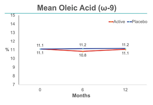 Figure 2. At 6 and 12 months, mean oleic acid was 5 to 6 times higher in the active group; there was no change in the placebo group.