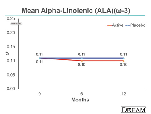Figure 3. At 6 and 12 months, mean alpha-linolenic acid acid was 5 to 6 times higher in the active group; there was no change in the placebo group.