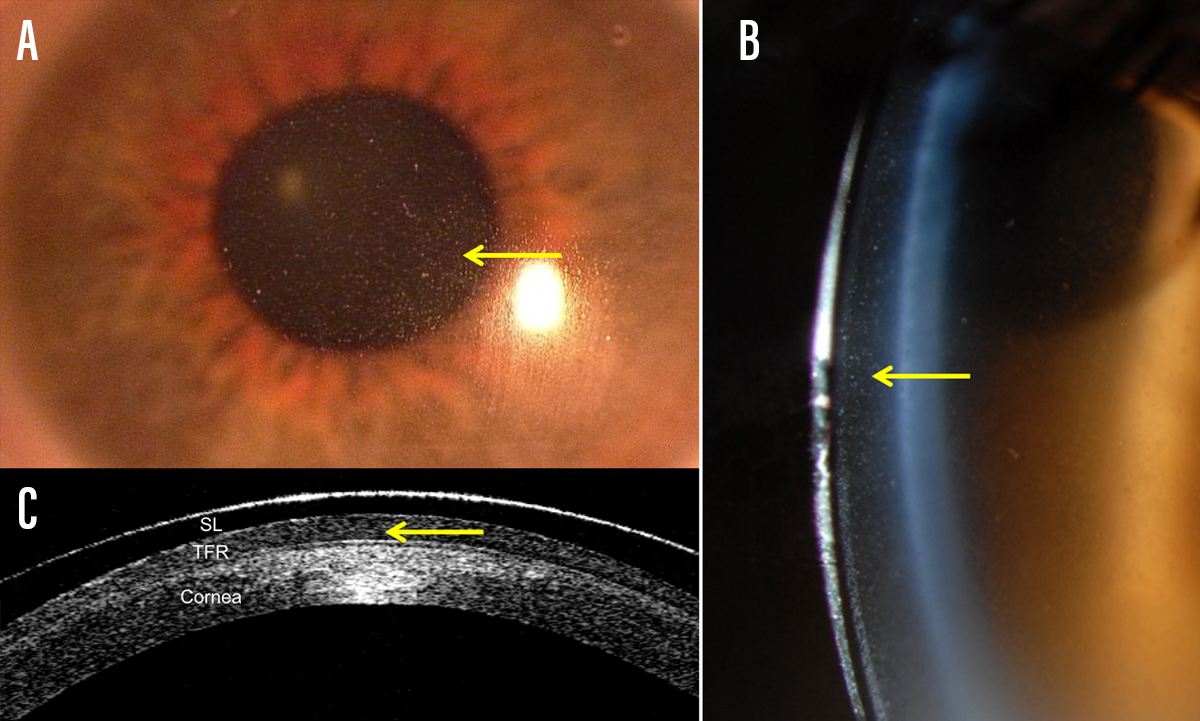 Figure 1. Midday fogging (indicated by yellow arrows) is visible on biomicroscopy as haziness over the pupil when viewed in full-field white light illumination (A). An optic section is used to localize the debris in the tear film reservoir (B). Debris is observable on OCT as hyperreflective debris in the tear film reservoir (C).
