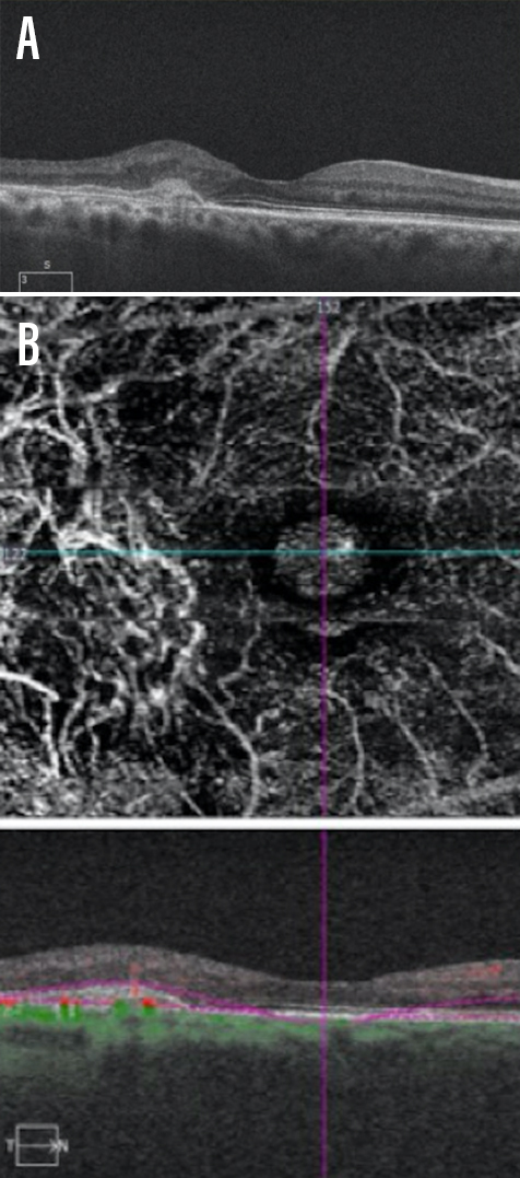 Figure 1. A patient presented with age-related macular degeneration with evidence of a hyperreflective lesion in the subretinal space (A). The hyperreflective region corresponded with atypical vascular structure on OCT-A (B).