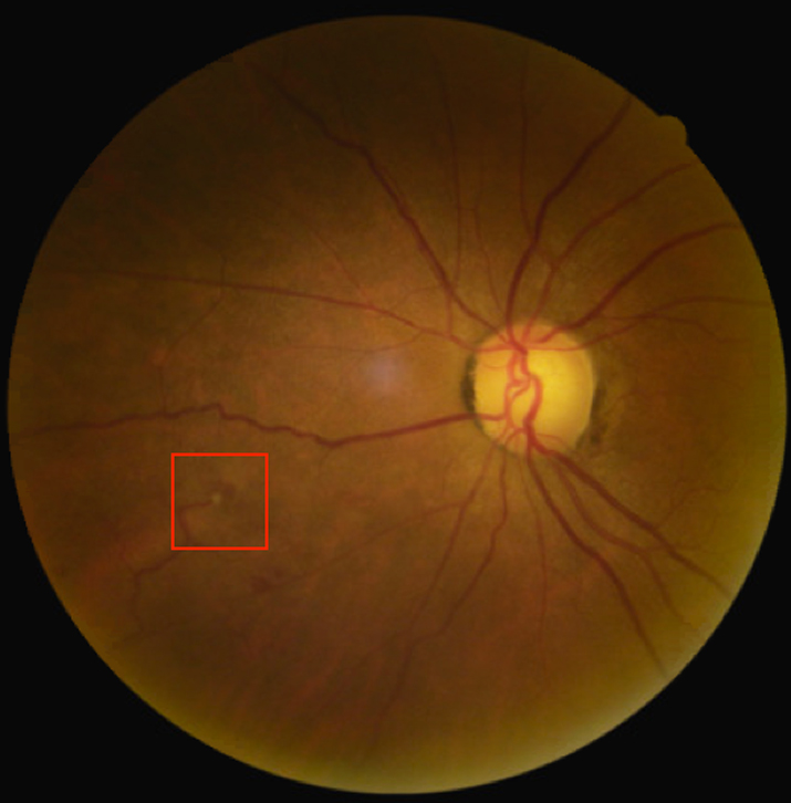 Figure 1. Fundus photo OS shows suspicious retinal vessel (red box) and scatted intraretinal hemorrhages in the inferonasal retina.