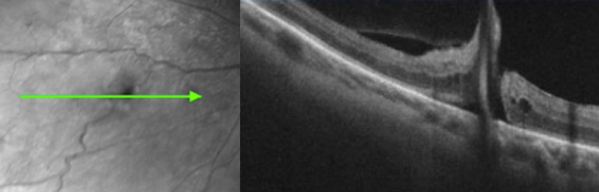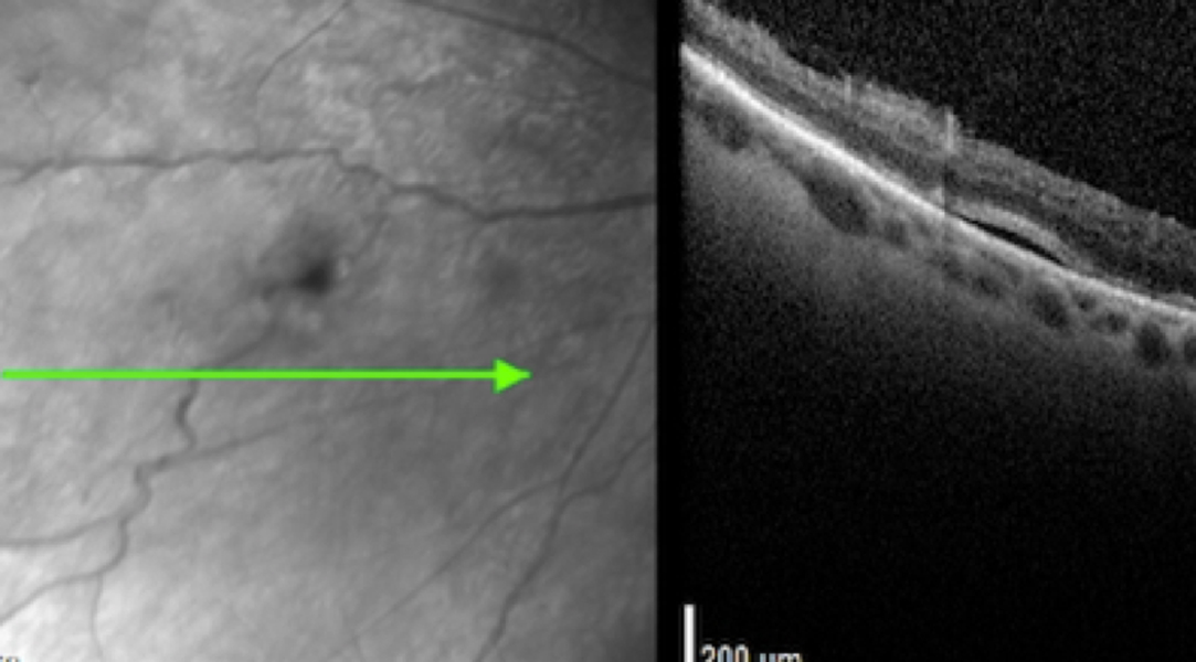 Figure 3: High-definition spectral-domain OCT OS revealed an isolated shallow area of fluid adjacent to the retinal break.