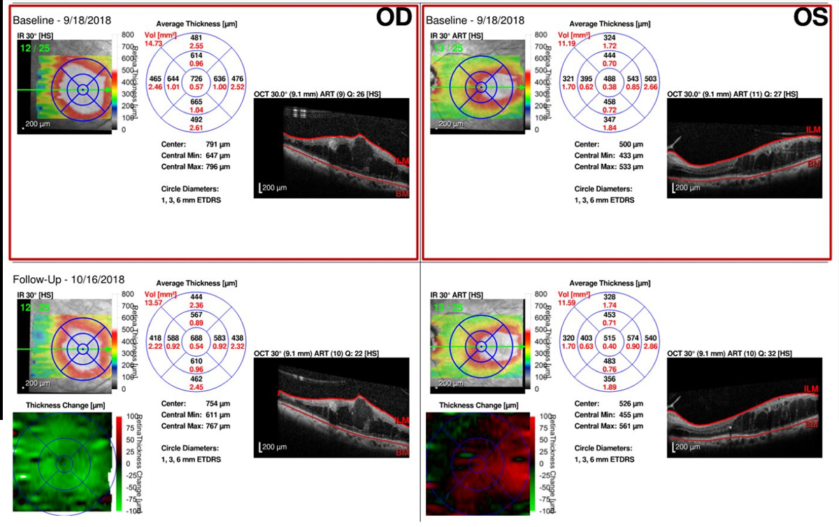 Figure 1. A spectral-domain OCT scan of a patient with diabetic eye disease at baseline (in red boxes) and at 1 month.